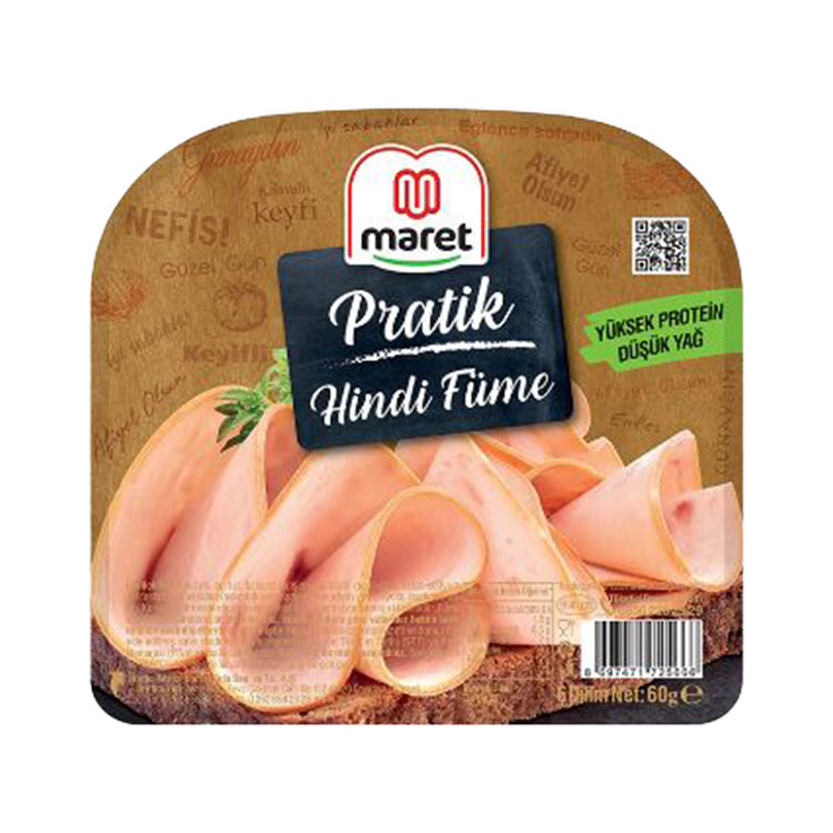 Yumurta Borsası’ndan temin edilen Maret Hindi Fume 60 gr, kaliteli hindi etinden üretilmiş ve hafif füme aromasıyla lezzetlendirilmiştir. Kahvaltılarda, sandviçlerde veya pratik öğünlerde keyifle tüketebilirsiniz.